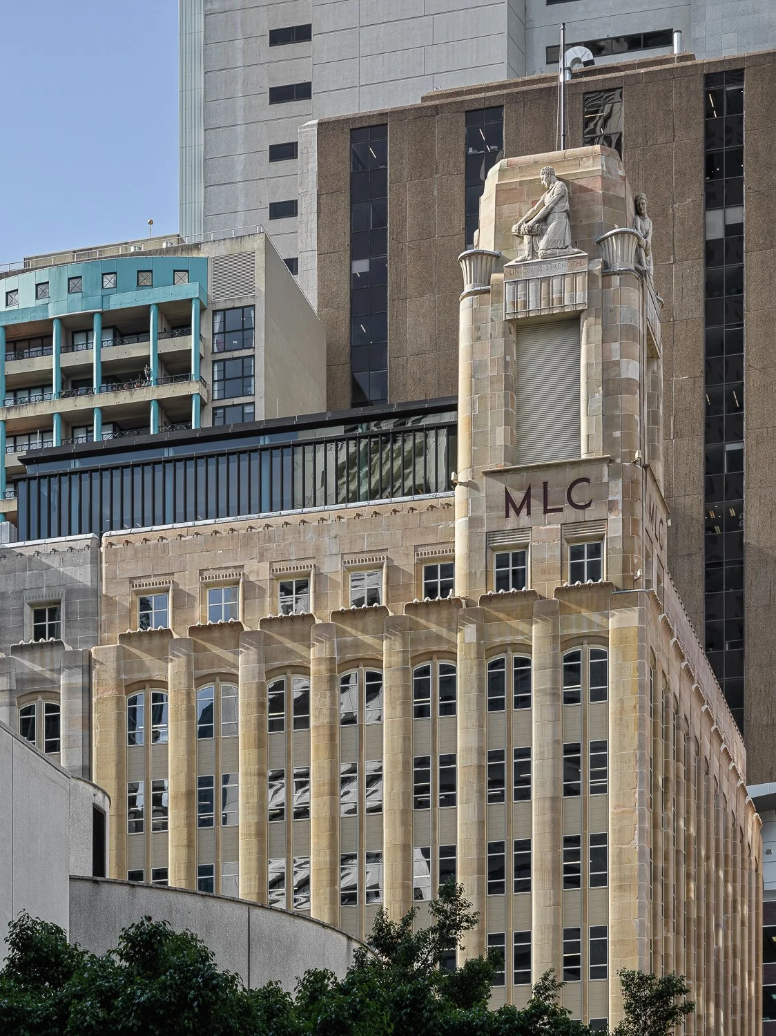Art Deco building exterior with statues and modern skyscrapers in the background.