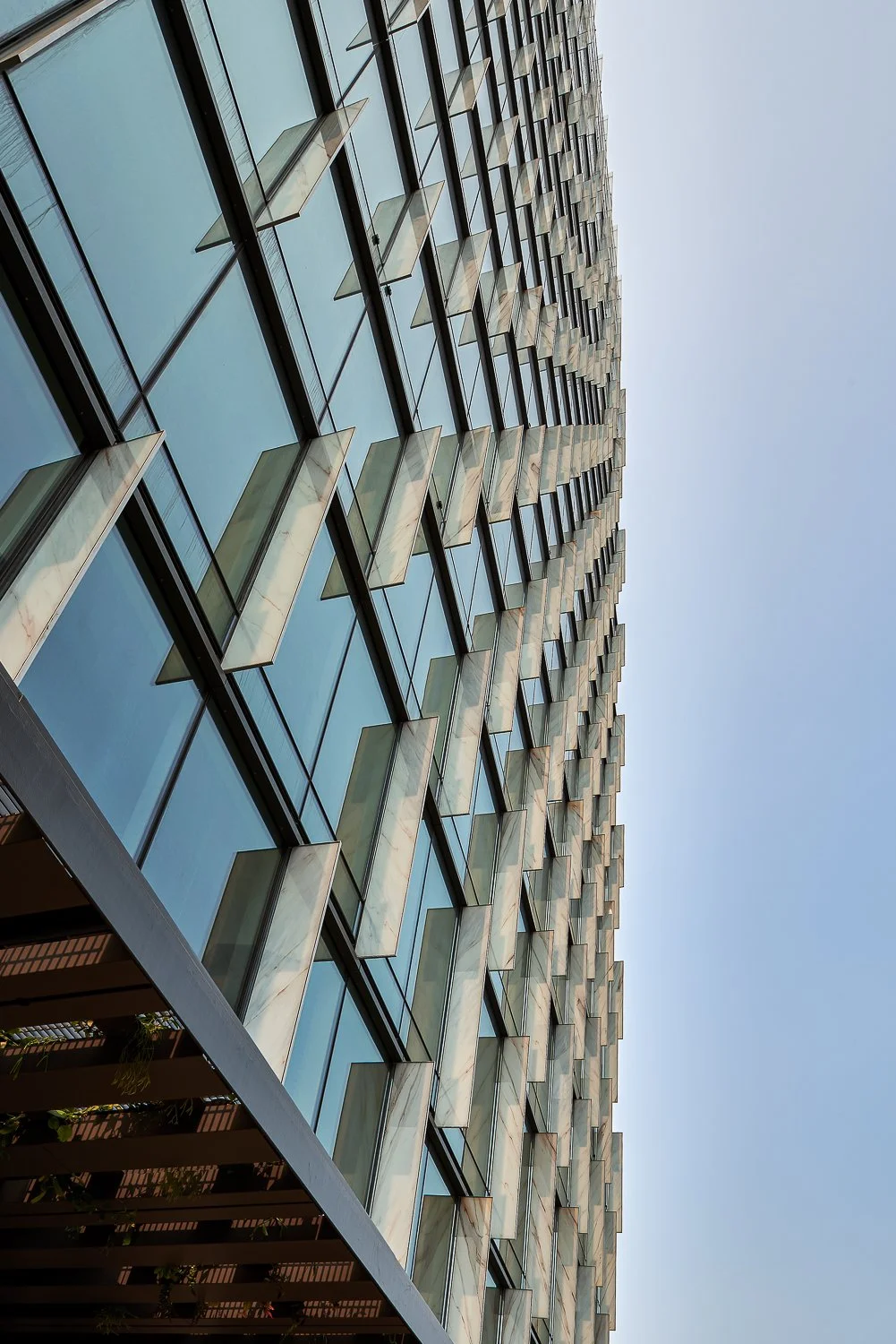 Close-up of a modern glass skyscraper with geometric patterns and reflections on the windows.