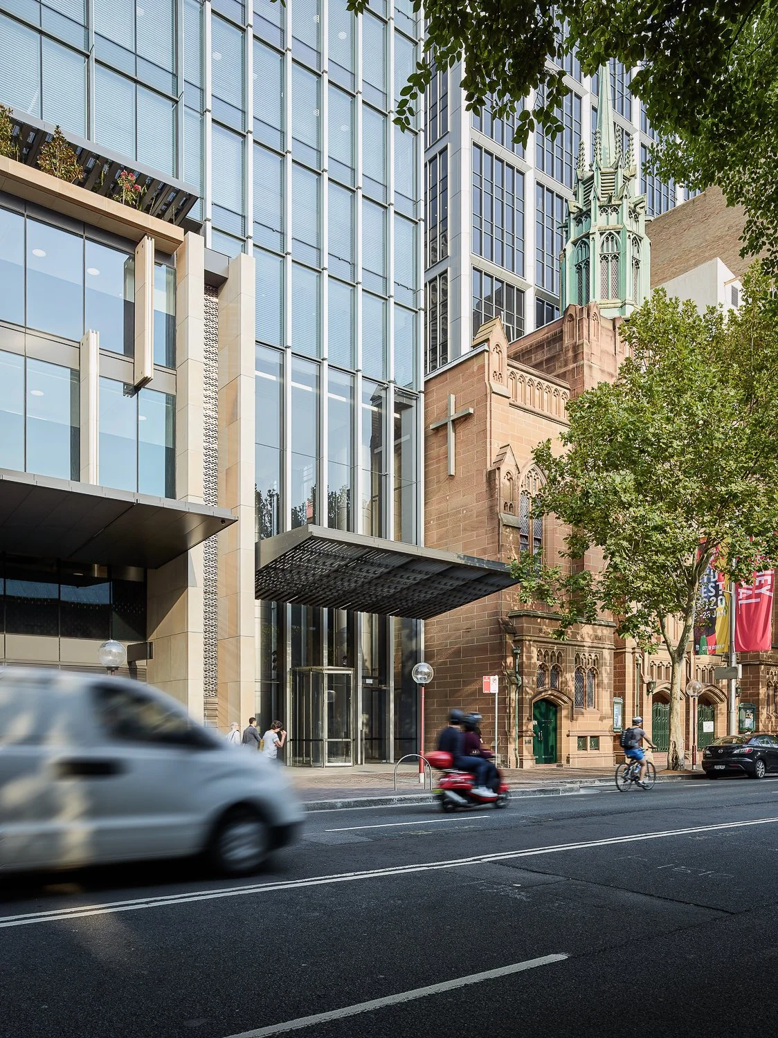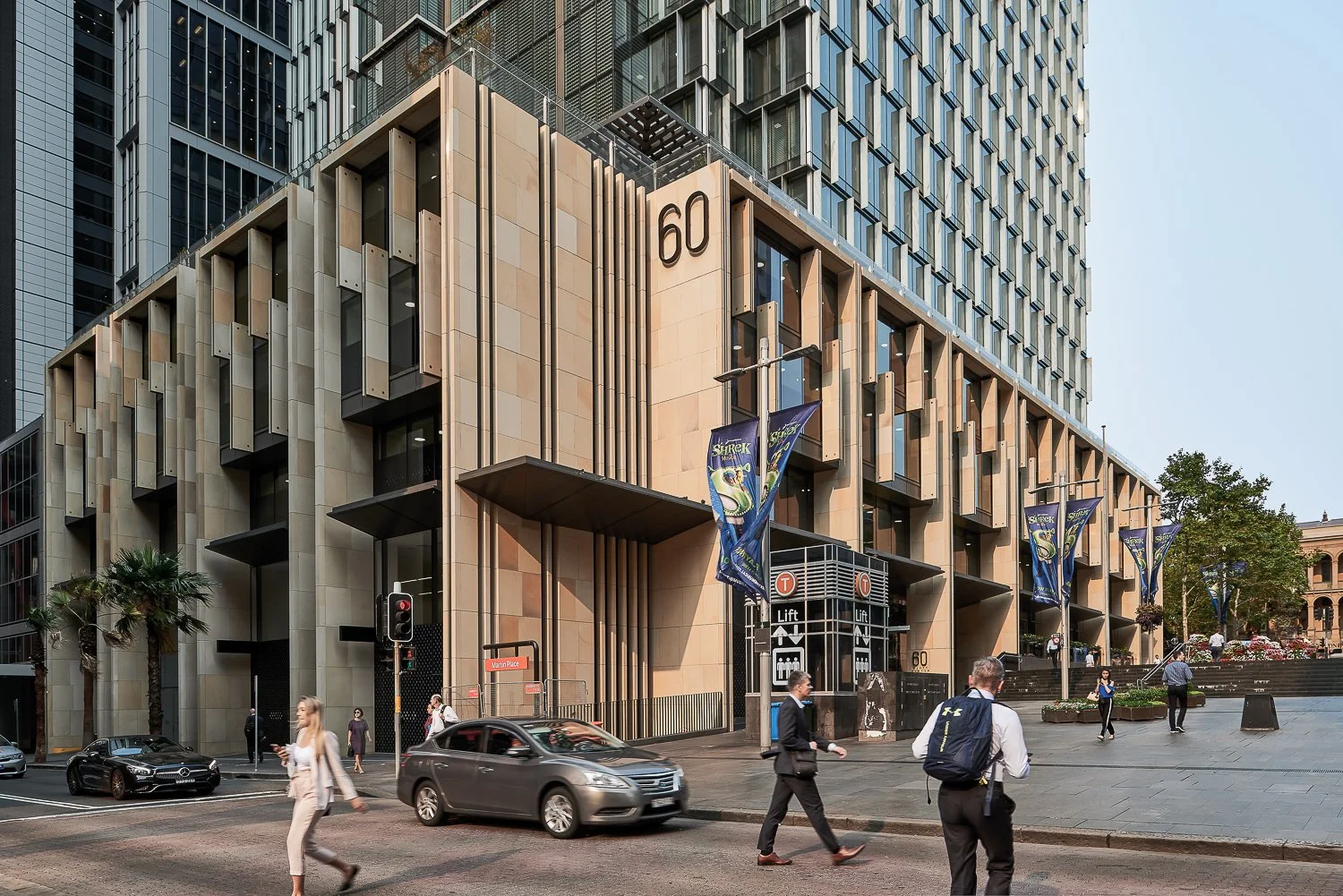 Modern lobby interior with gray and brown chairs, a black desk with two people, and "Sixty Martin Place" sign.