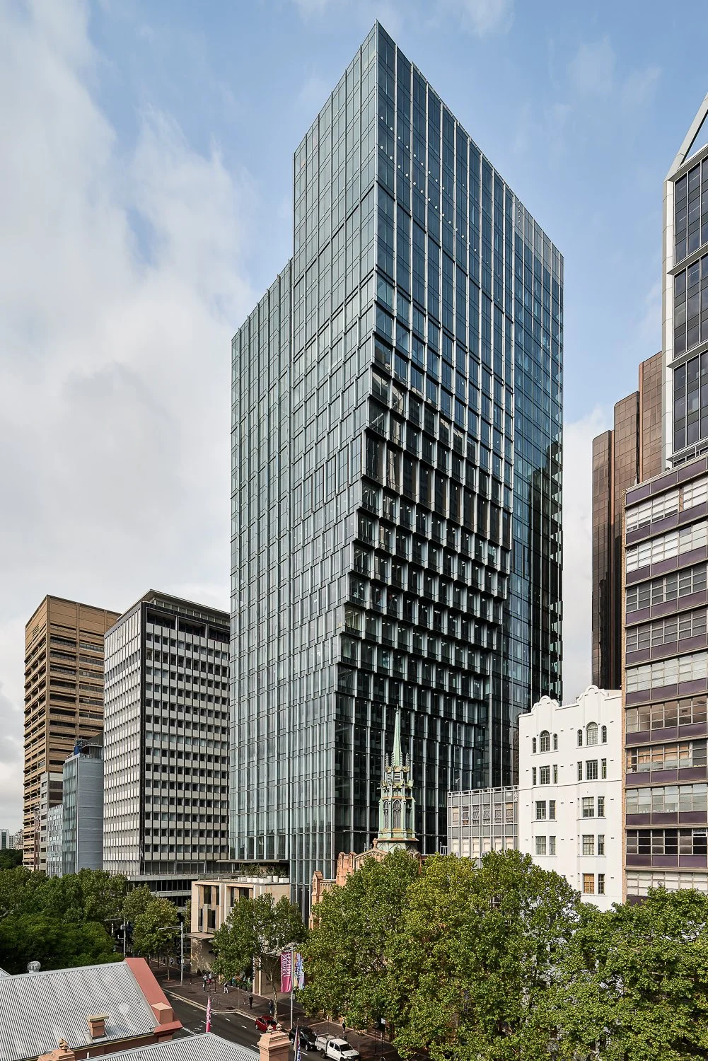 Modern skyscraper with reflective glass facade in an urban setting, surrounded by other tall buildings and trees.