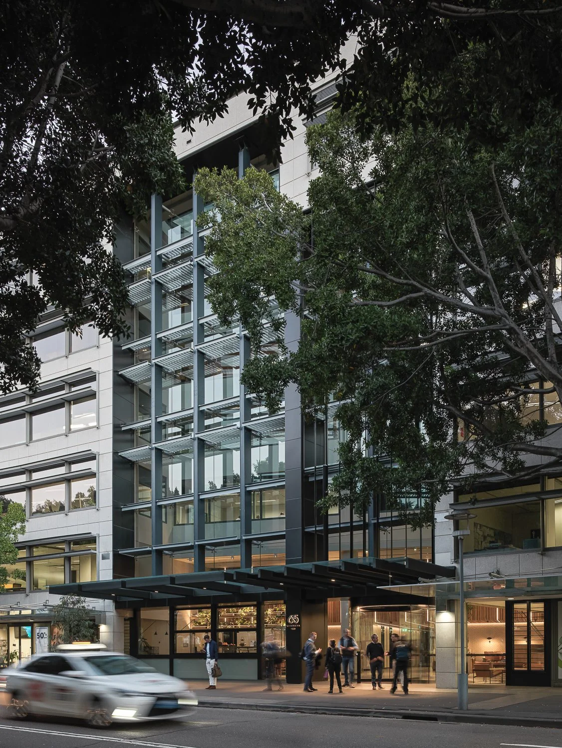 Modern office building exterior with glass facade, street view, and motion blur from a passing vehicle. The entrance is illuminated, showcasing interior decor.