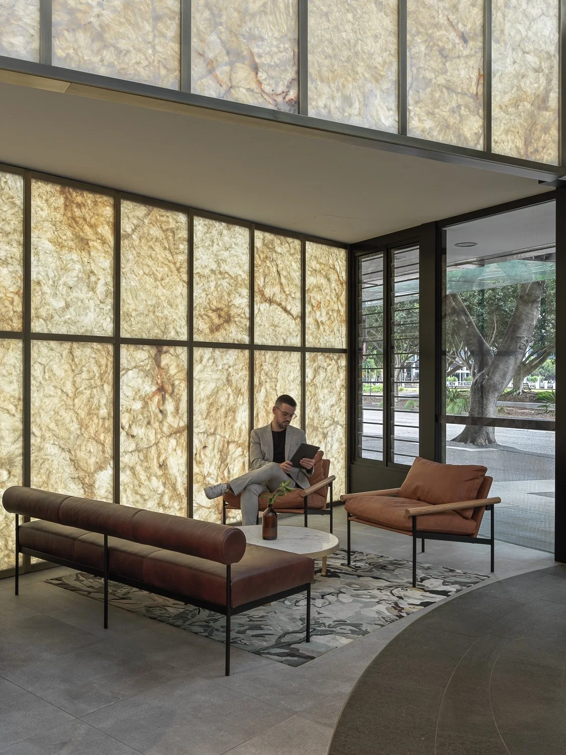 Modern lounge area with a man reading on a tablet, surrounded by leather seating and a round table. The room features a natural stone textured wall and large windows with a view of trees.
