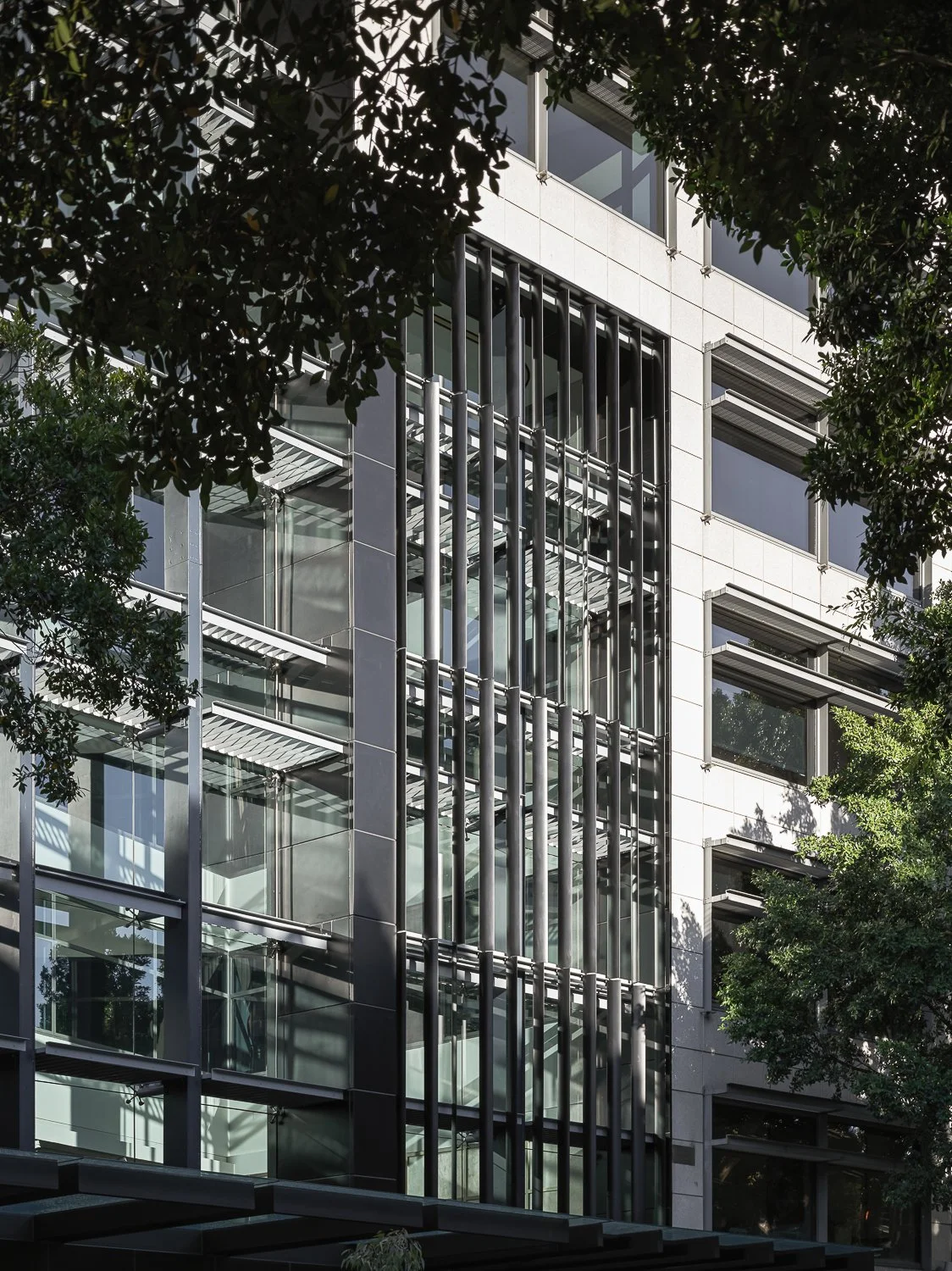 Modern office building with glass facade and vertical louvers surrounded by trees.