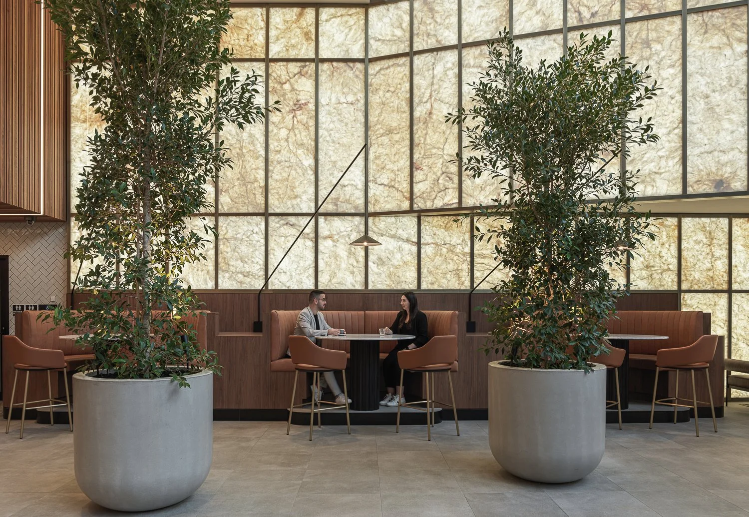 Modern cafe interior with two large potted plants, booth seating, and two people sitting at a table.
