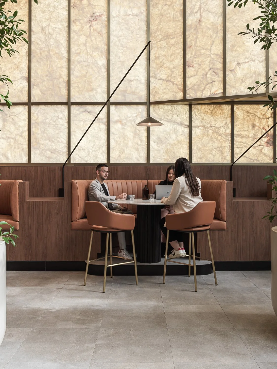 Three people sitting at a table in a modern cafe with booth seating and a laptop open in front of them, surrounded by plants and a large textured wall in the background.
