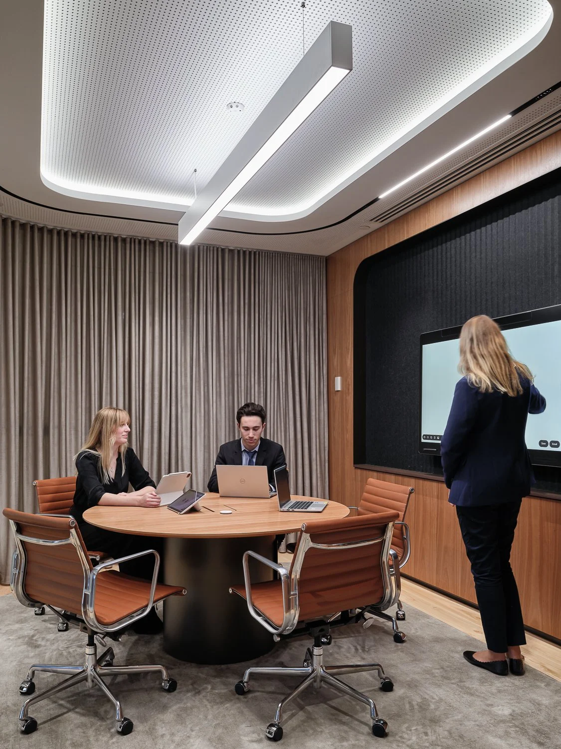Modern office conference room with glass walls, wooden furniture, and a meeting taking place. Three people are present, with two seated and one standing. A digital screen is visible on the wall.
