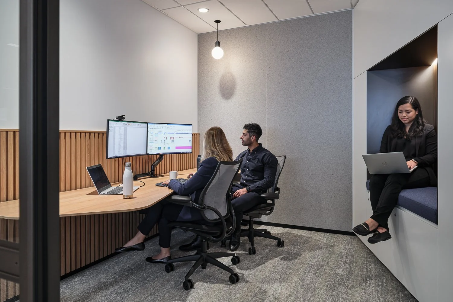 Three people in a modern office workspace, two sitting at a desk with dual monitors, and one sitting in a booth with a laptop.